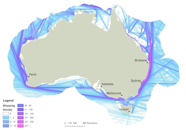Australia has good shipping regulations, and the general public strongly values marine life. Even so, these drastic increases in both commercial and recreational vessels are likely to lead to more injuries and deaths of marine mammals, large fish and turtles that are hit by vessels – particularly among whale populations that are rebounding in number since the end of whaling.